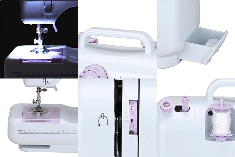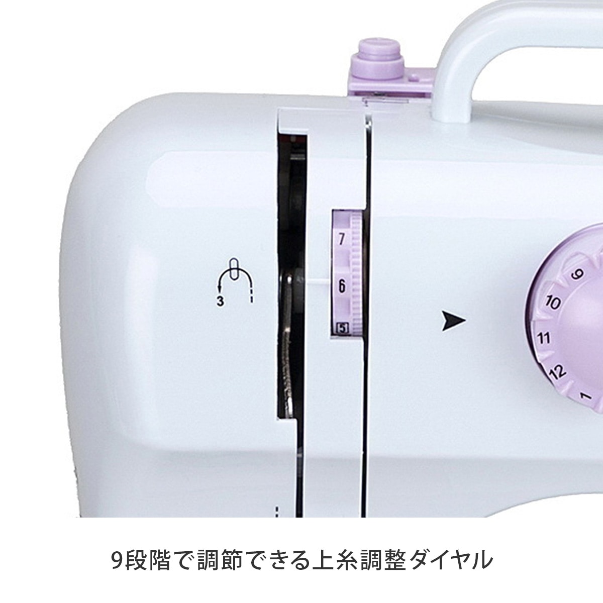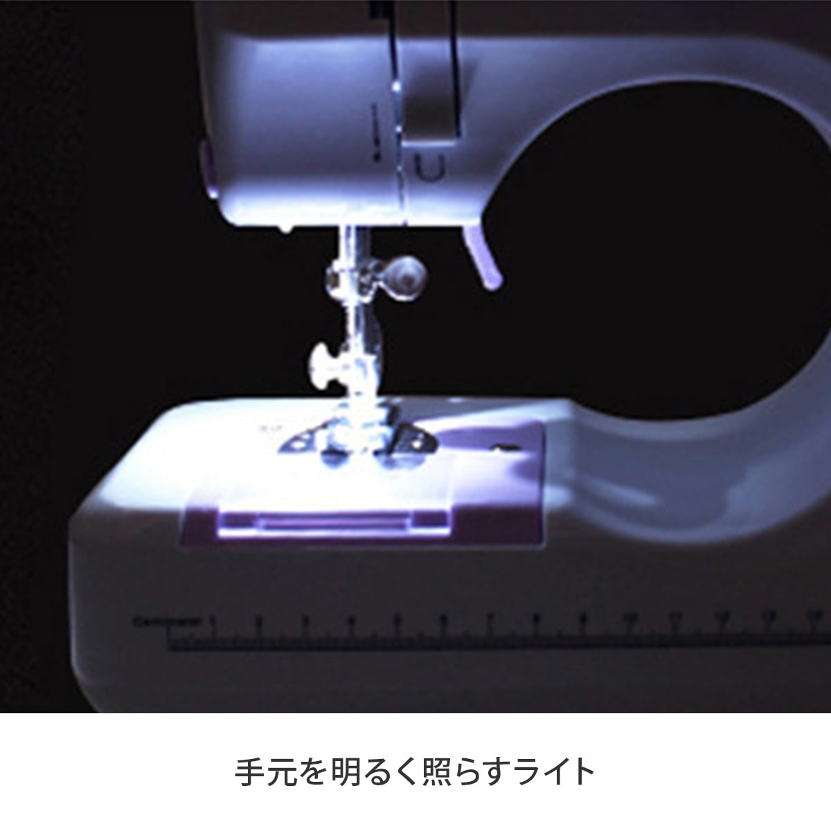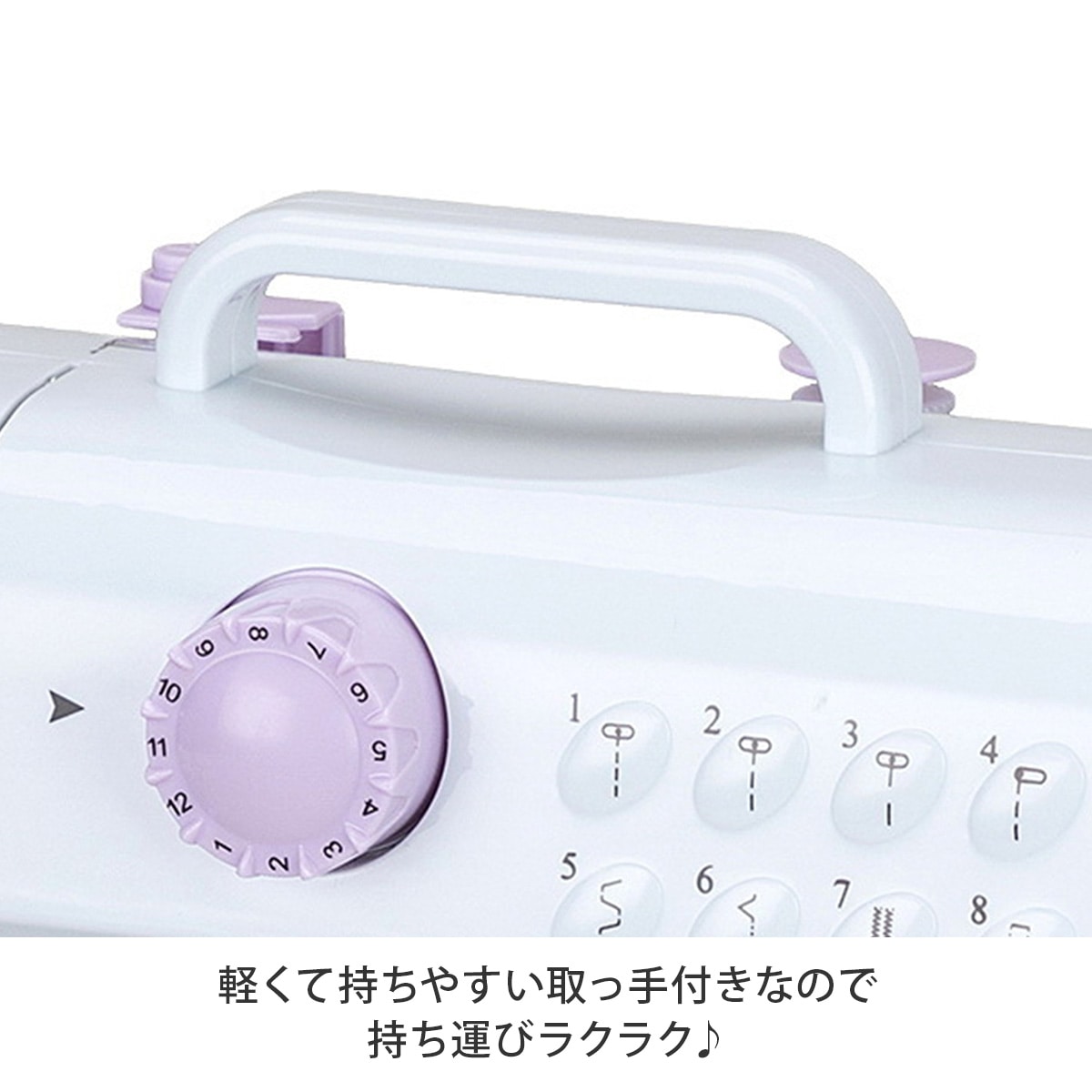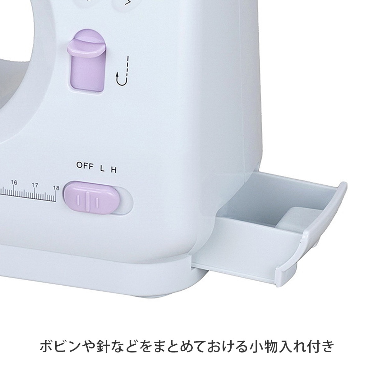 手元を明るく照らすライト、持ち運びに便利な取っ手、ボビンや針などをまとめておける小物入れ、9段階で調節できる上糸調整ダイヤル、上糸と同じ糸を下糸としてボビンに巻ける糸巻きなど、ミシンを使い慣れた方にも納得の機能です。