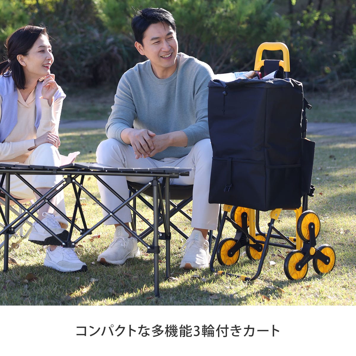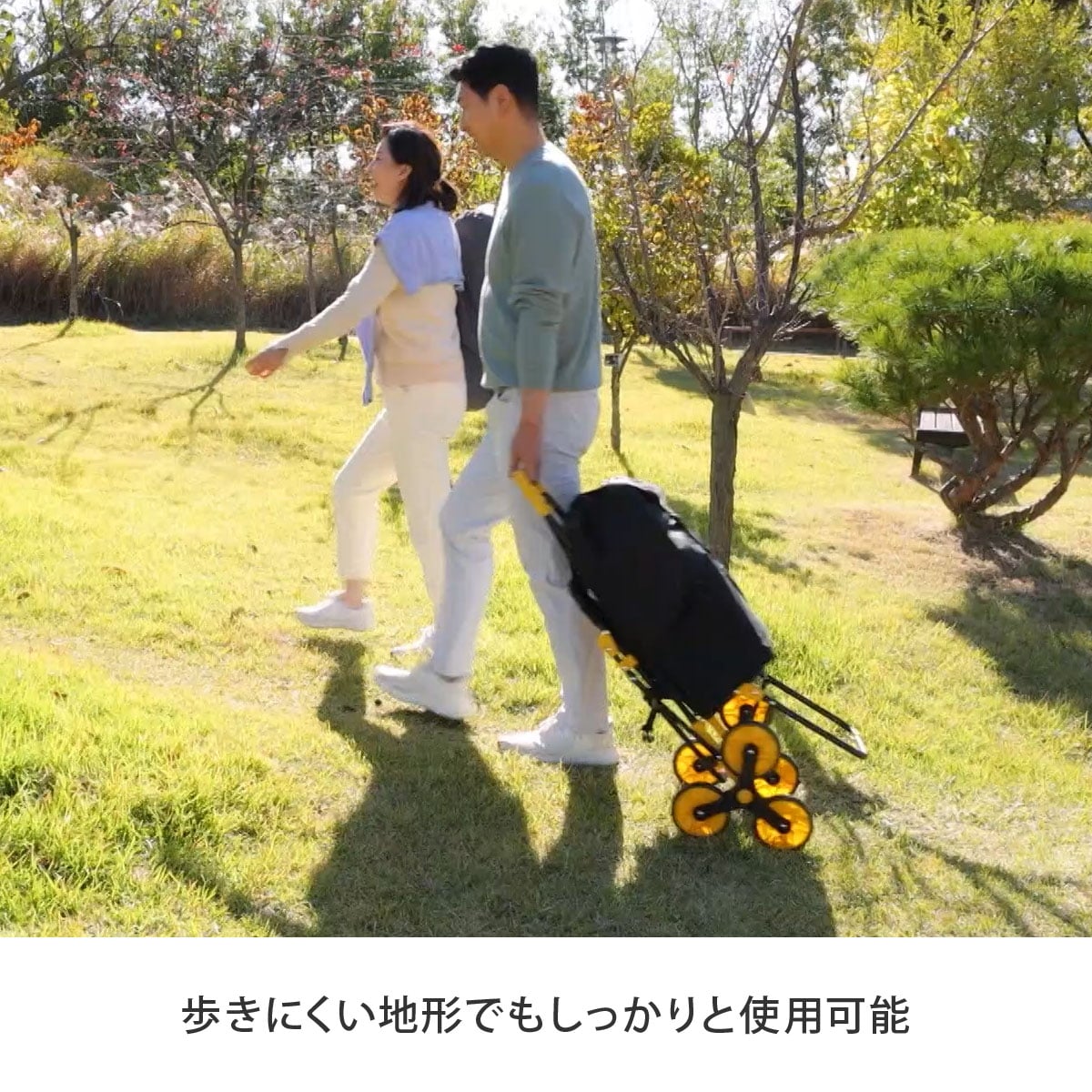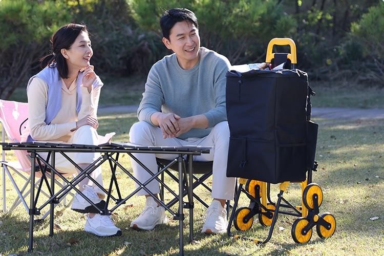 イージーカートは、3つのタイヤが付いたホイールも回転するため、タイヤが段差をしっかりととらえ、従来のショッピングカートよりラクに荷物を運ぶことができます。キャンプ場など、デコボコした場所も、3輪で地面をとらえるので、荷物を運ぶのもラクラク!