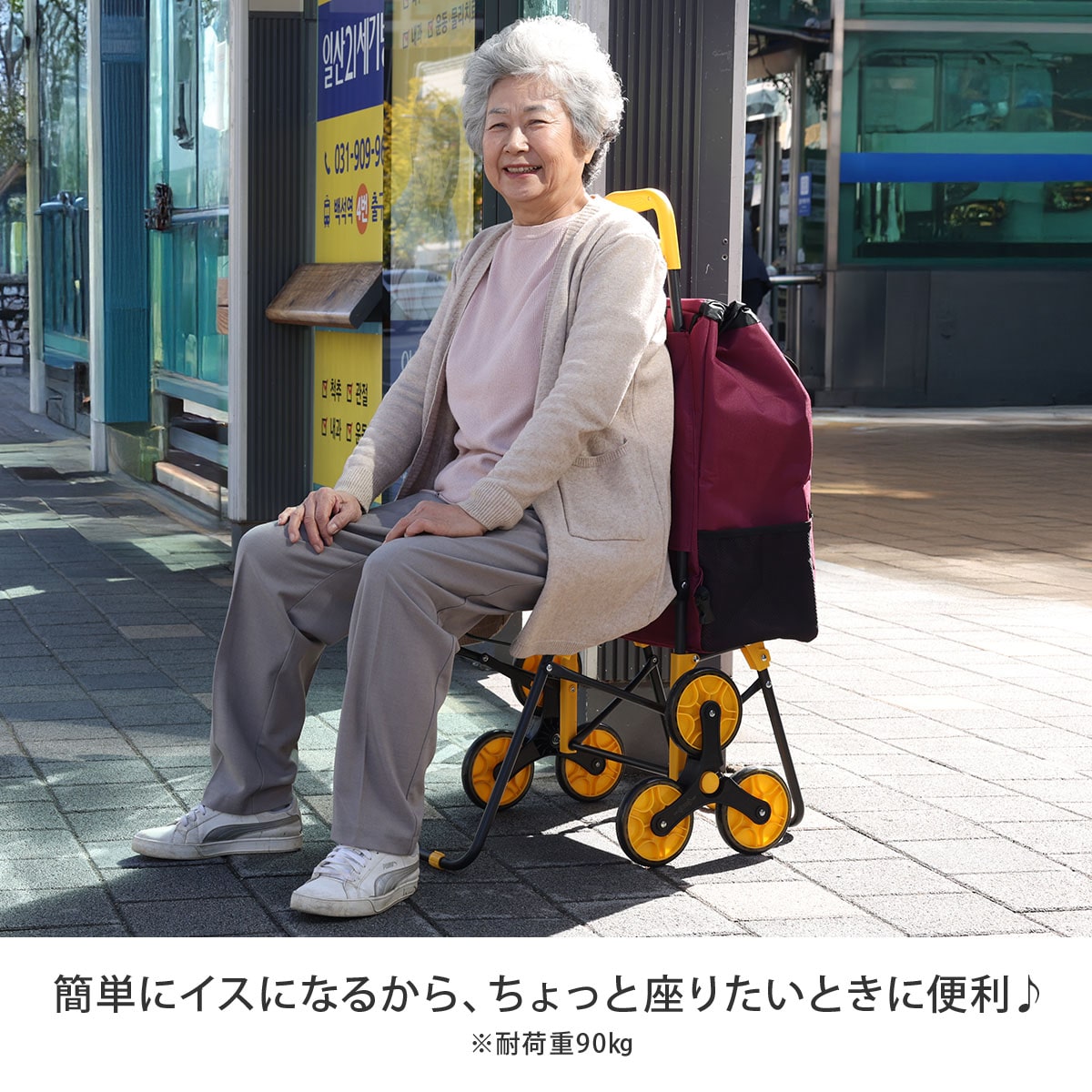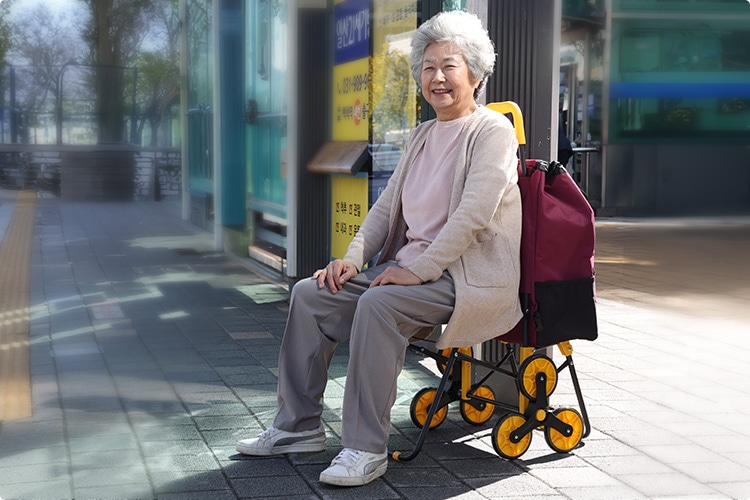 「イージーカート」は、イスとしても使える便利なショッピングカートです。お買い物やお散歩の途中で疲れたときには、さっと開いてその場で休むことができます。