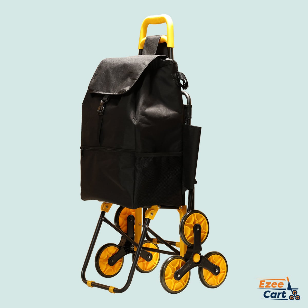 イージーカートは、荷台の耐荷重が30kg(階段使用時は耐荷重20kg)あるので、大きい荷物は、キャリーバッグを外して専用フックバンドで固定して運ぶことができます。また、車輪を外して折りたためるので、収納場所に困りません。