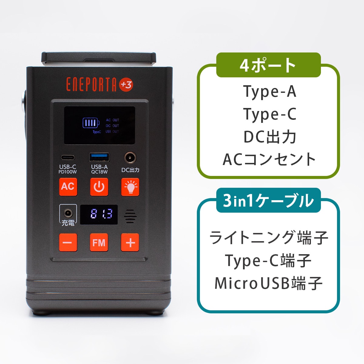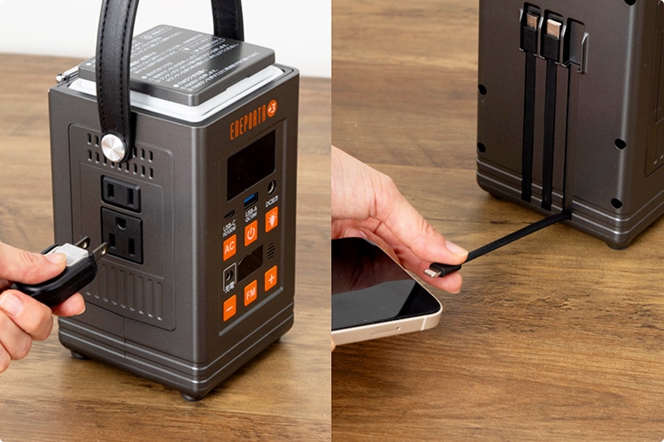 ライトニング端子、Type-C端子、Micro USB端子の3in1ケーブルを使えば、PCやスマートフォンなどを充電できます。また、Type-A、Type-C、DC出力、ACコンセントの4ポートも搭載しているので、扇風機や電気毛布など、あらゆる家電の電源としてもお使いいただけます。災害時や緊急時の安心にも繋がります。