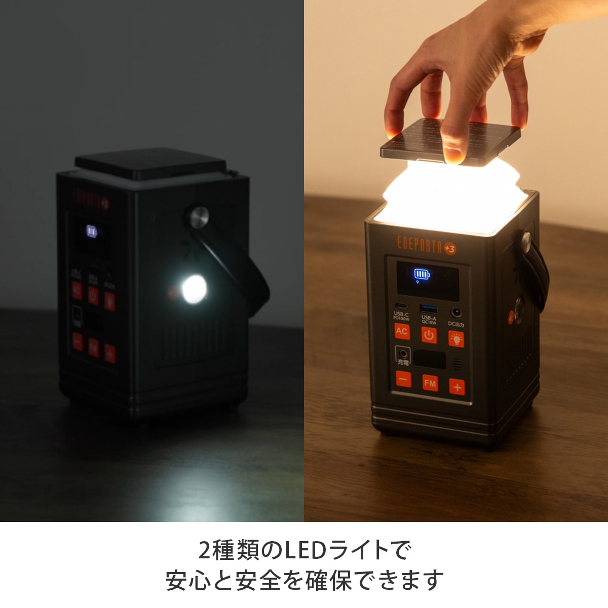 エネキューブは、日々の暮らしはもちろん、非常時や災害時、アウトドアでも役立つコンパクトな大容量蓄電池です。約1.2kgと軽量ながら、ライフラインに必要不可欠なポータブル電源、LEDライト、FMラジオの3つの機能を搭載!電源が無くてもスマートフォンなどを充電したり、FMラジオ(ワイドFM対応)を視聴することができます。白色LEDと暖色ランタンLEDの2色のライトを搭載しているので、停電時にも灯りを確保でき、身の安全にもつながります。専用のソーラーパネルを使えば、電源を使わずにエネキューブを充電することができるので経済的!万が一の備えとして1台あると安心です。