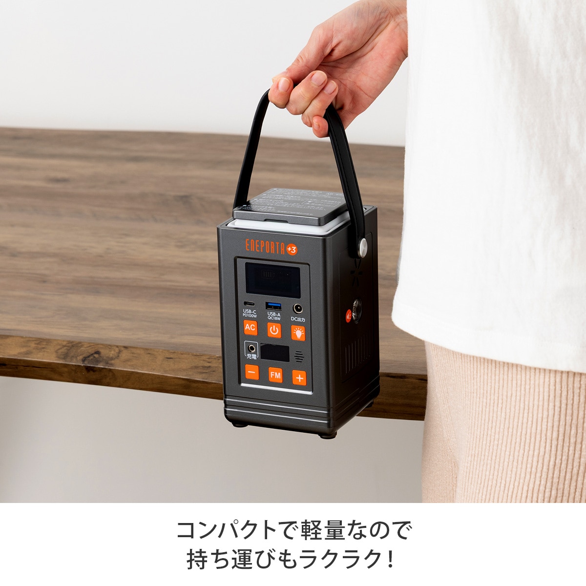 エネキューブは、日々の暮らしはもちろん、非常時や災害時、アウトドアでも役立つコンパクトな大容量蓄電池です。約1.2kgと軽量ながら、電源・灯り・情報収集の3つのライフラインをカバー!電池容量は28,000mAhと大容量なのに、片手でラクに持ち運びできます。