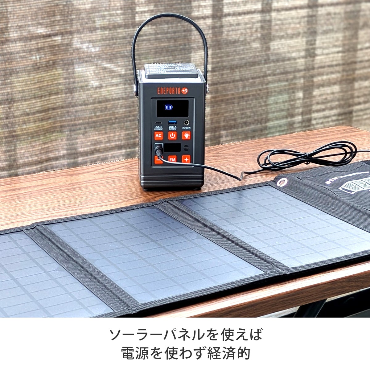 オプションのソーラーパネルを使えば、電源を使わず日の光でエネキューブを充電できるので、電気代がかからずとっても経済的!充電を気にすることなく、いつでも気軽にエネキューブをお使いいただけます。
