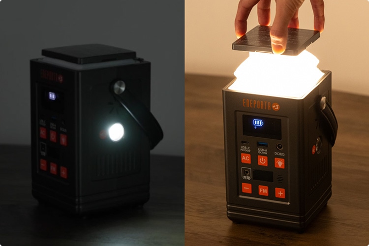ライフラインに必要不可欠な灯りはなんと2種類!本体側面には白色のLEDライトを搭載しており、点滅に切り替えることもできるので助けが必要な状況でもご使用いただけます。本体上部を引っ張ると暖色のランタンに!明るさを2段階に切り替えることができます。