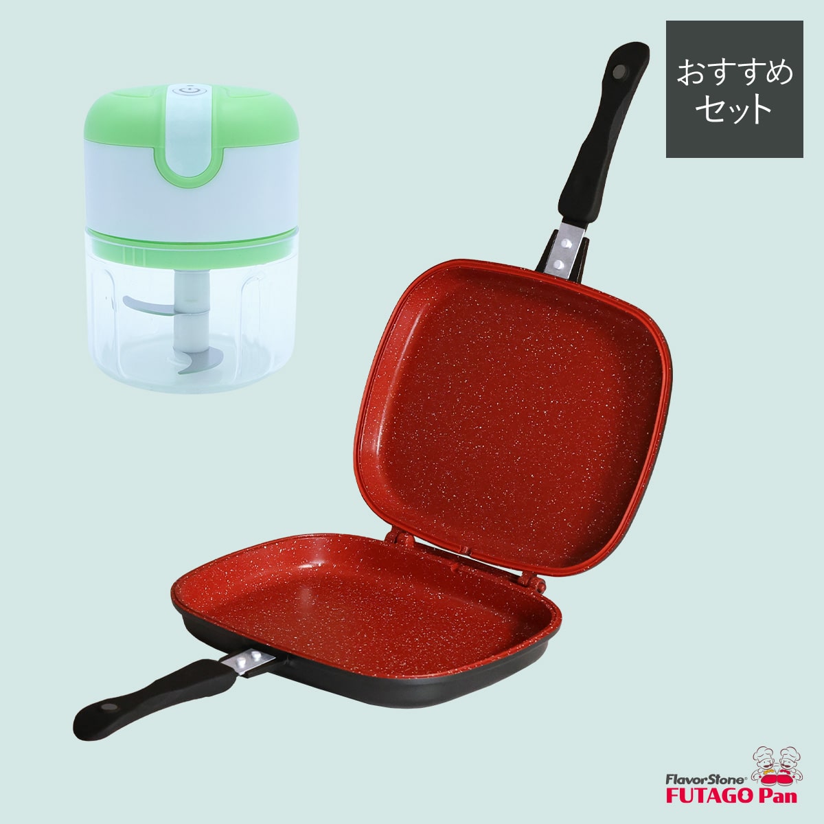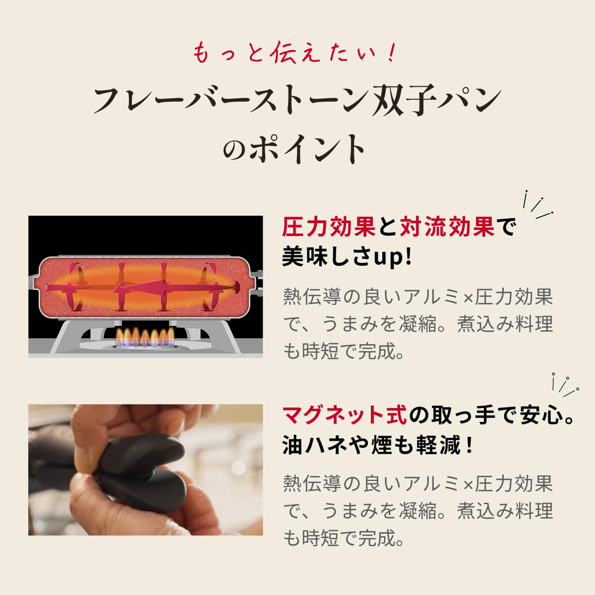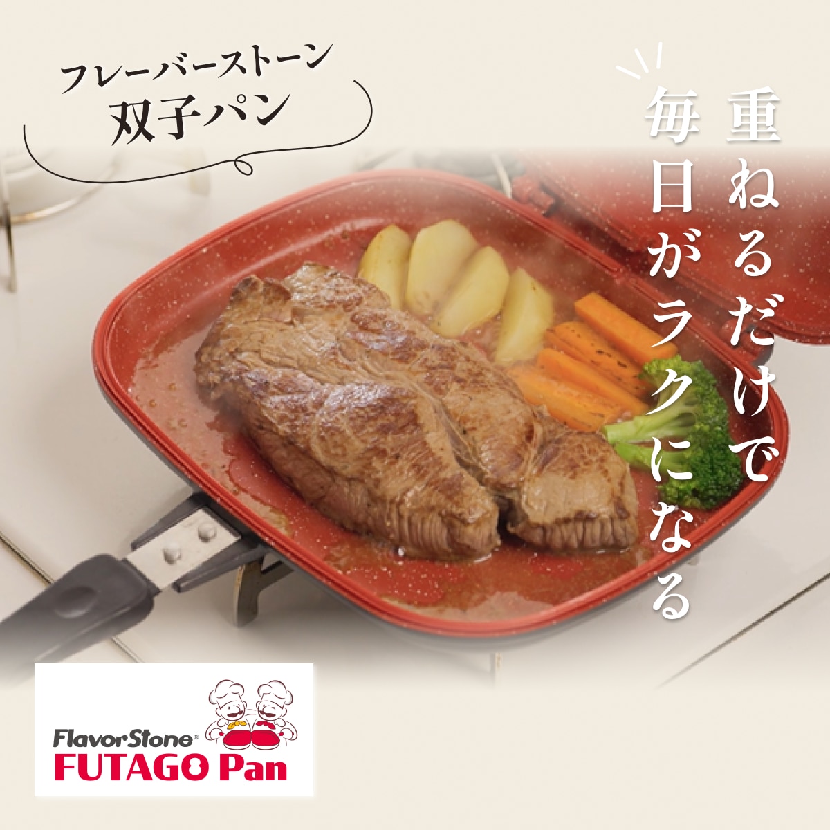 重ねるだけで 毎日がラクになる 両面がピタッとくっつき しっかり密閉! 油ハネや煙を軽減! くっつきにくく 焦げつきにくい 汚れもスルッととれる! 油がなくてもOK! お料理を健康的に くっつきやすい卵料理も 油無しでOK ※商品のデザイン、仕様に関しては変更される場合がございます。 大人気フレーバーストーンシリーズから、2枚のフライパンが1台になったフライパンが登場。 両面焼きスタイルなので、フライ返し不要で簡単調理。 取り外して1枚ずつでも使用可能。 フライパン同士が上下でフィットして、熱を逃がしにくい構造なので、圧力効果と対流効果でうまみを閉じ込め、油ハネや煙、調理時間も軽減。 焼く、炒める、煮る、蒸す、炊く、茹でる、オーブン風調理と1台7役でマルチに使えるフライパンになっております。 ※掲載画像はガス火専用です。IH対応版とは外面のデザインが異なります。 フレーバーストーン双子パン のポイント くっつきにくく、耐摩耗性を備えた多層構造のフライパン! フレーバーストーン双子パンは、ノンスティックコーティングの多層構造でくっつきにくく、さらにダイヤモンド粒子を含むコーティングも施した耐摩耗性のあるフライパンです。耐摩耗テストで60万回をクリアしているから優れた耐摩耗性は実証済み※。油なしでも調理ができるのでとってもヘルシーにお料理が楽しめます。 ※一般財団法人日用金属製品検査センター調べ 1台7役の両面フライパン! フレーバーストーン双子パンは、焼く、炒める、煮る、蒸す、炊く、ゆでる、オーブン風調理までできる1台7役の万能フライパンです。ハンバーグやラザニア、イカの丸焼きなど、多様な料理を手早く簡単に!料理のバリエーションがぐっと広がります。 くるっとひっくり返して ラクラク両面調理 閉じたままひっくり返せるので、フライ返しを使わず調理可能!返すのが難しいハンバーグもふっくら焼けてジューシーに、こびりついて身が崩れやすい魚も簡単にひっくり返せて皮はパリッと、中はふっくらと仕上がります。 ※掲載画像はガス火専用です。IH対応版とは外面のデザインが異なります。 美味しく、ヘルシーに。 この一台で多様な料理。 フレーバーストーン双子パン のポイント 圧力効果と対流効果で美味しさup! 熱伝導の良いアルミを採用しているため、圧力効果と対流効果でうまみをしっかり閉じ込め、食材の美味しさを引き出します。 圧力効果で煮込み料理もあっという間で時間短縮! マグネット式の取っ手で安心。 油ハネや煙も軽減! 取っ手は磁石でくっつくから安心してひっくり返すことができます。さらに密閉もしっかりされるので、油ハネや煙を軽減し、キッチン周りの掃除の手間も省くことができます。 オイルカットでヘルシーに! 食材から出た余分な油や水分はヘルシースポットに溜まるので、オイルカットされて健康的な料理を作ることができます! 2枚のフライパンに分けて 時短調理! フライパン同士をスライドさせるだけで簡単に取り外せるので、同時に2品調理可能! 焼きそばも短時間で調理できます。