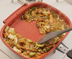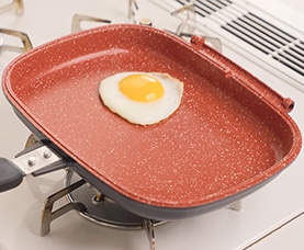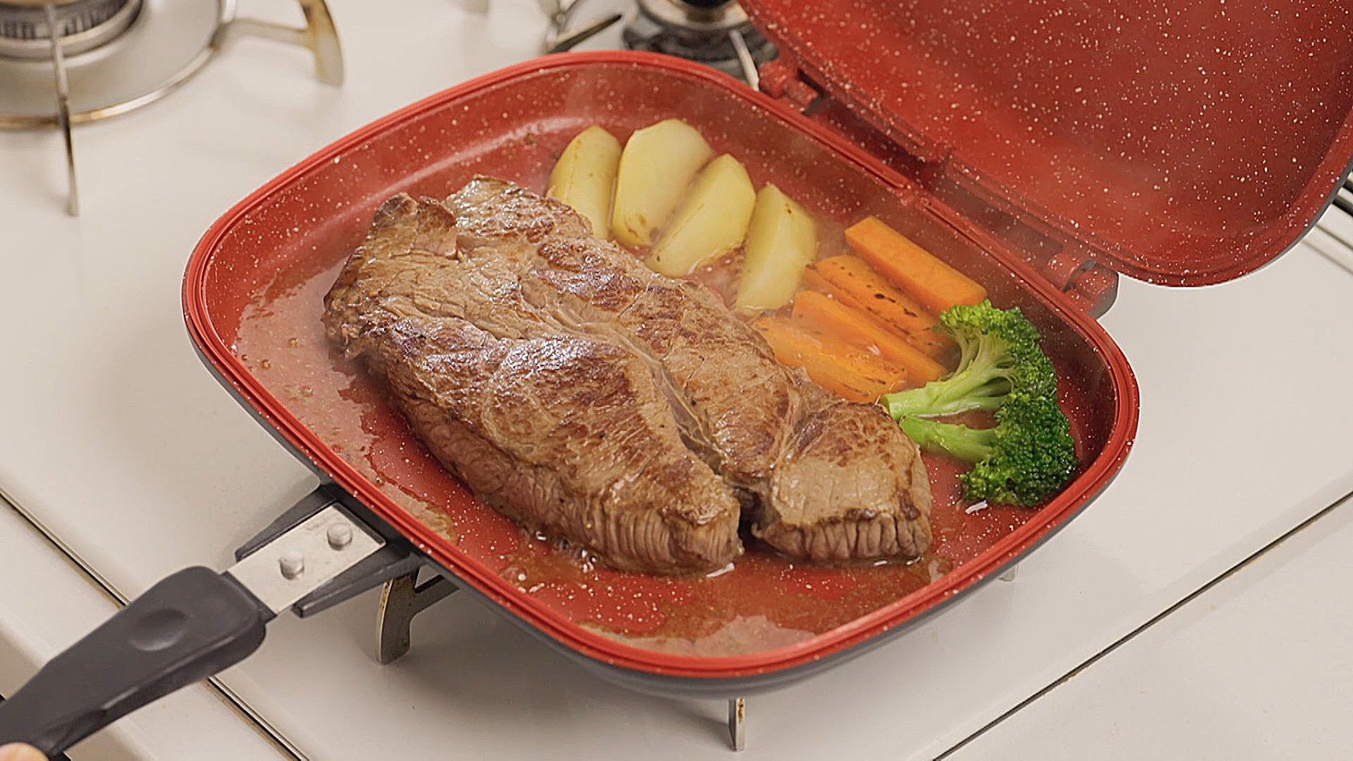 フライパン同士が上下でフィットして、熱を逃がしにくい構造なので、圧力効果と対流効果でうまみを閉じ込め、油ハネや煙、調理時間も軽減。