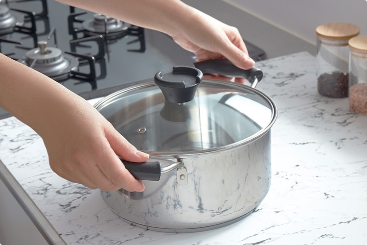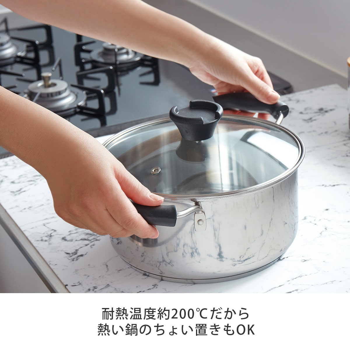 シリコン素材の高い耐熱性で、約200℃まで対応。調理中の熱い鍋やフライパンもそのまま置けます。ちょっとした一時置きに便利で、お料理の作業効率もアップ!熱に強いから、置き場所に迷わずすぐ使えるのが嬉しいポイント。