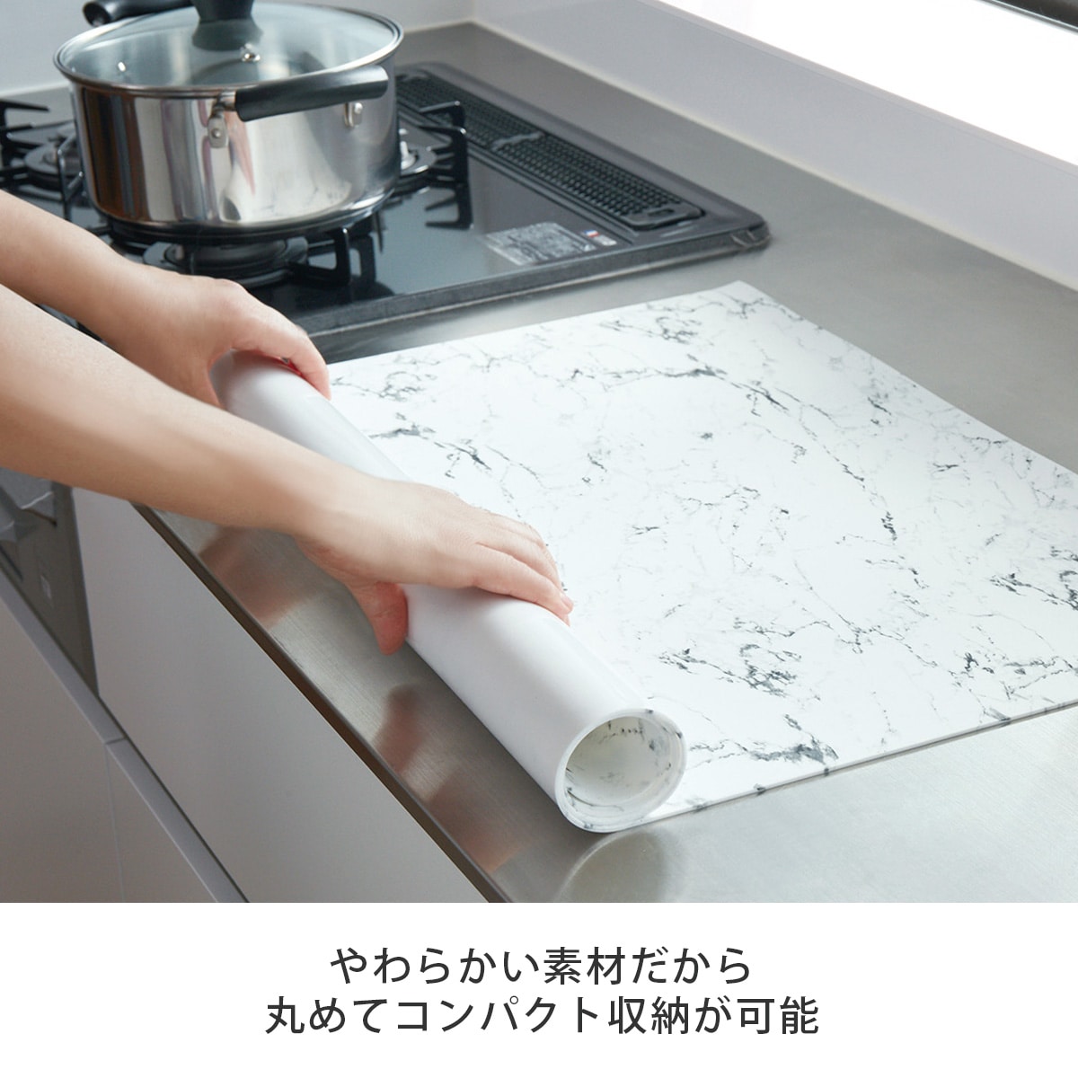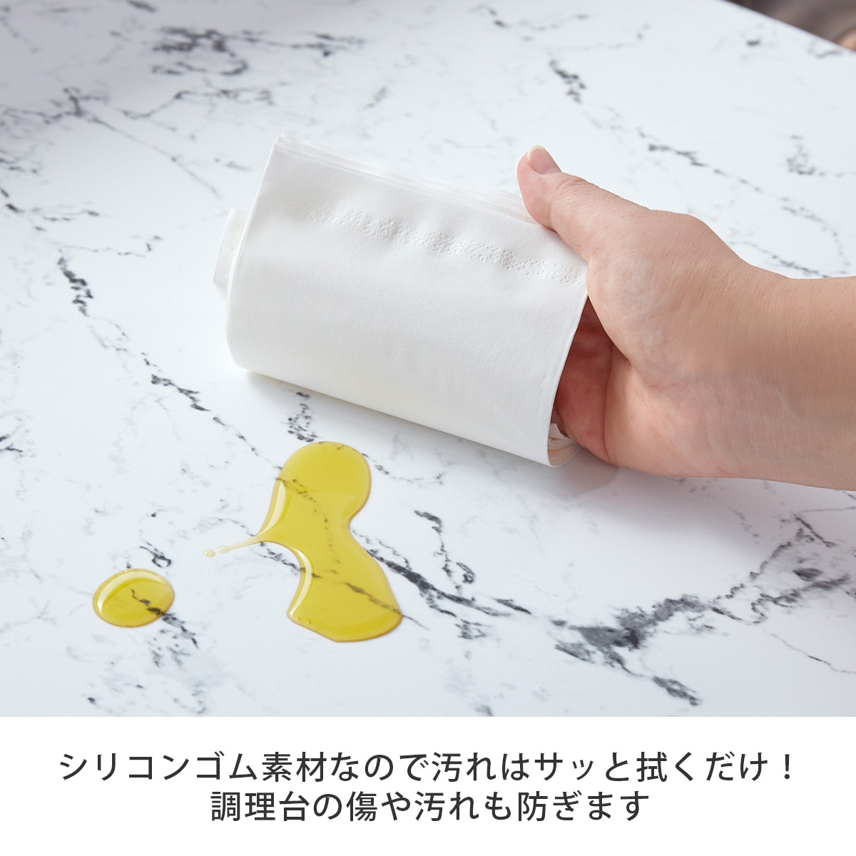 「フワピタフルサイズシリコン調理台マット」は、調理台を傷や汚れから守る頼れるアイテム。滑り止め加工でズレにくく、パン作りやまな板調理も快適。耐熱200℃で熱い鍋も安心して置けます。シリコン素材だから汚れもサッと拭くだけ。サイズは60×40cmから90cmまで選べ、調理台に合わせて自由にカット可能。丸めて収納できる柔軟性も魅力。大理石調と白無地の2カラー展開で、キッチンに馴染むデザインです。
