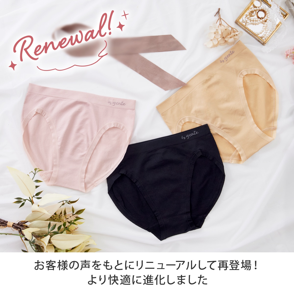 ノンワイヤーブラ「ジニエ」とお揃いのショーツ!シリーズ特有の伸縮性を、ショーツにも生かして快適な履き心地を実現しました。