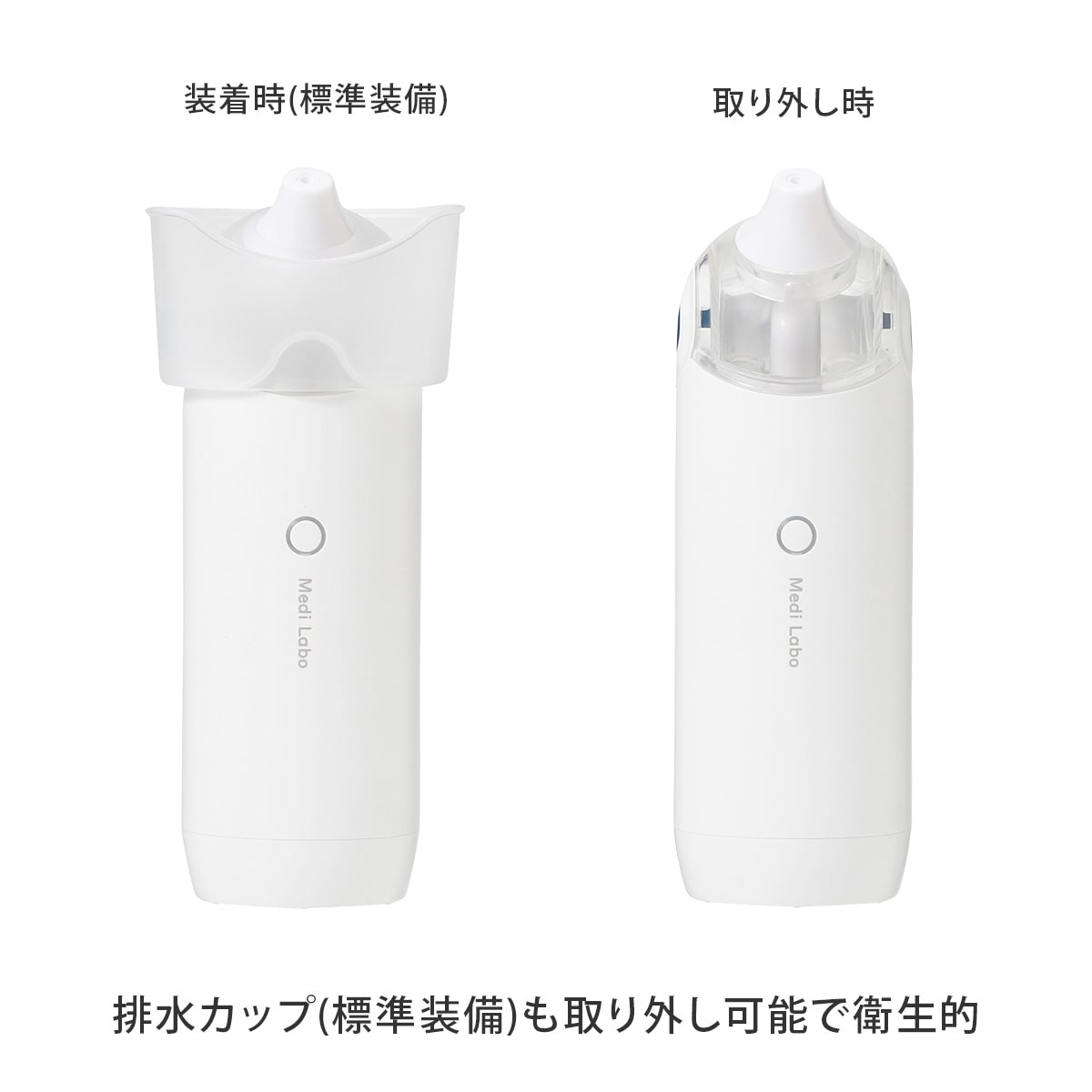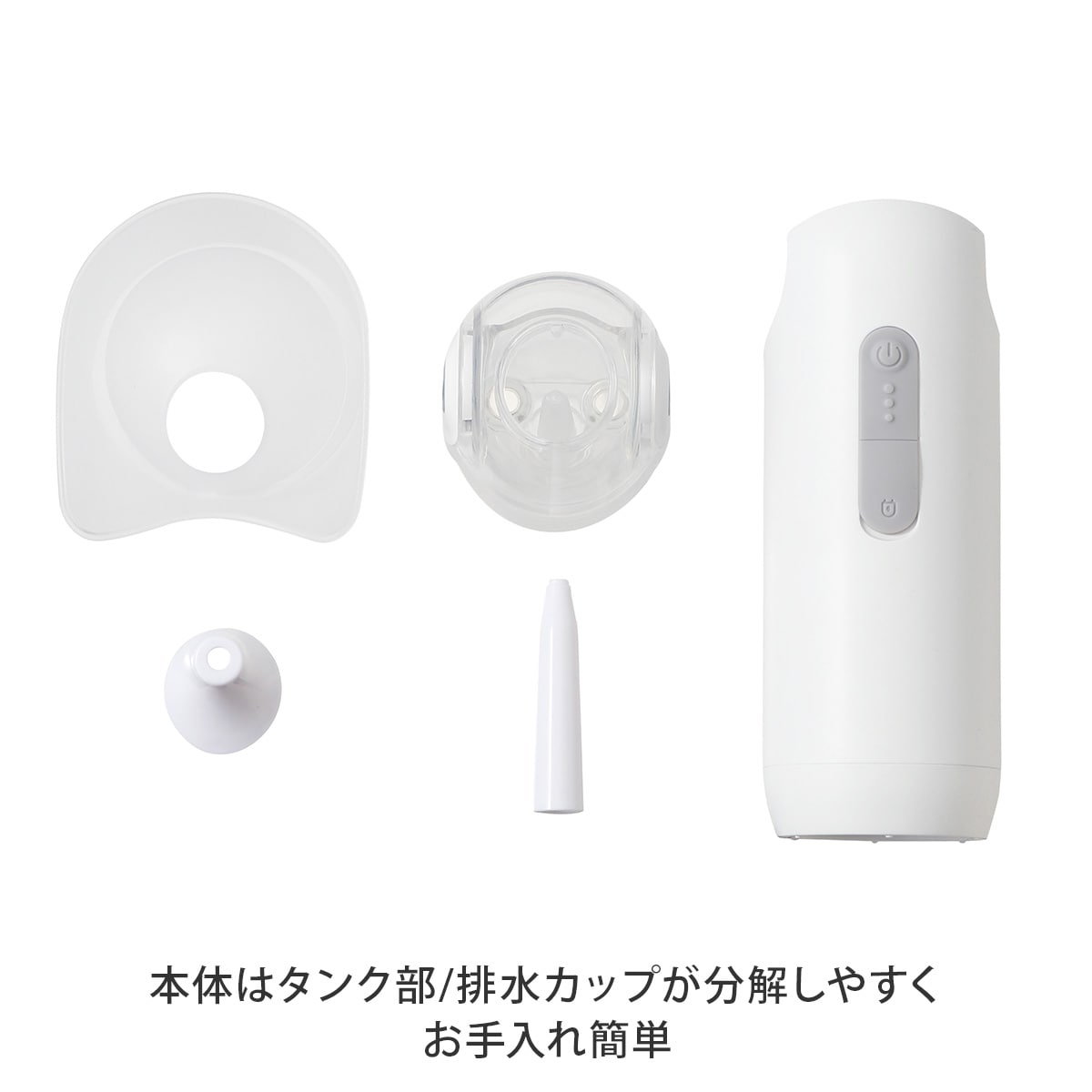 標準装備の排水カップは脱着可能。使用後の水分をしっかり受け止め、取り外して洗えるので、いつでも清潔に使えます。タンク部と排水カップも分解しやすく、洗浄後のお手入れがカンタン。