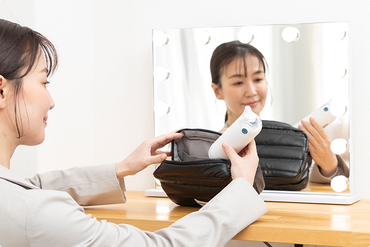 はなミストは、幅約5cm・高さ約15cmのコンパクトサイズ。USB充電式で、バッグに入れて持ち運びも簡単。旅行や外出先でも鼻洗浄ができるので、花粉やウイルス対策をいつでもどこでも行えます。