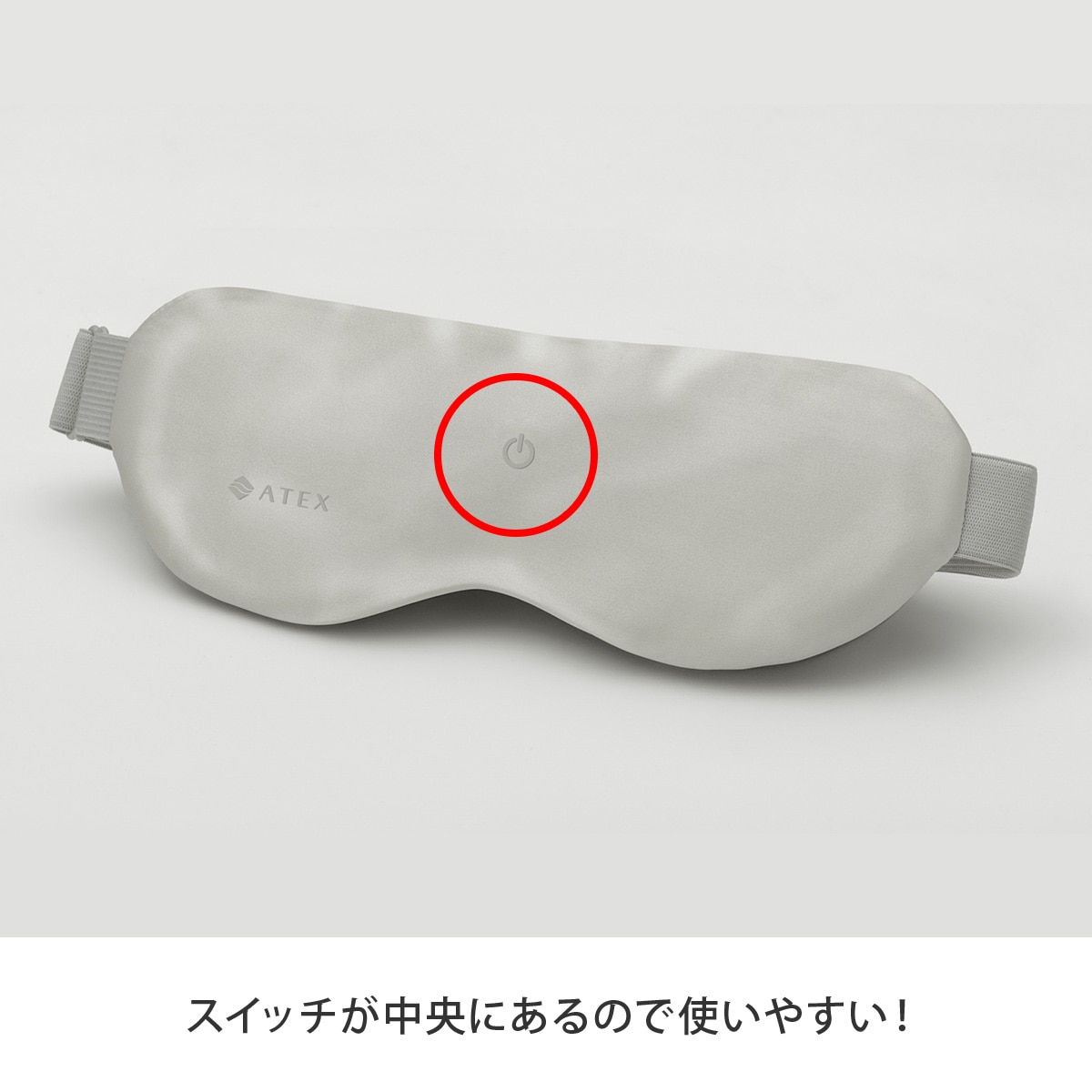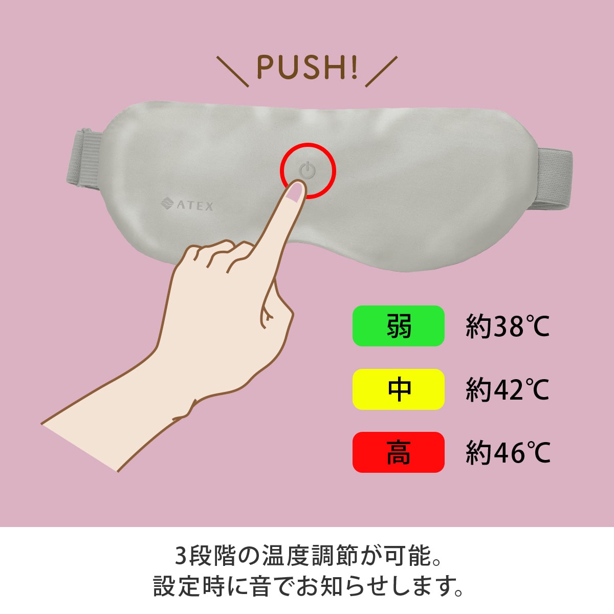コードレスホットアイマスクは、3段階の温度調節が可能。設定時に音でお知らせし、つけたままで簡単に調整できます。