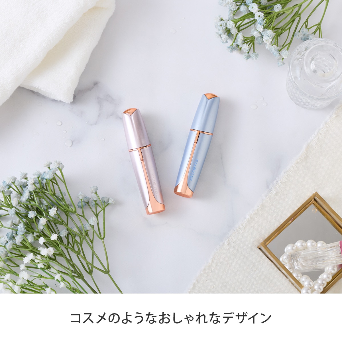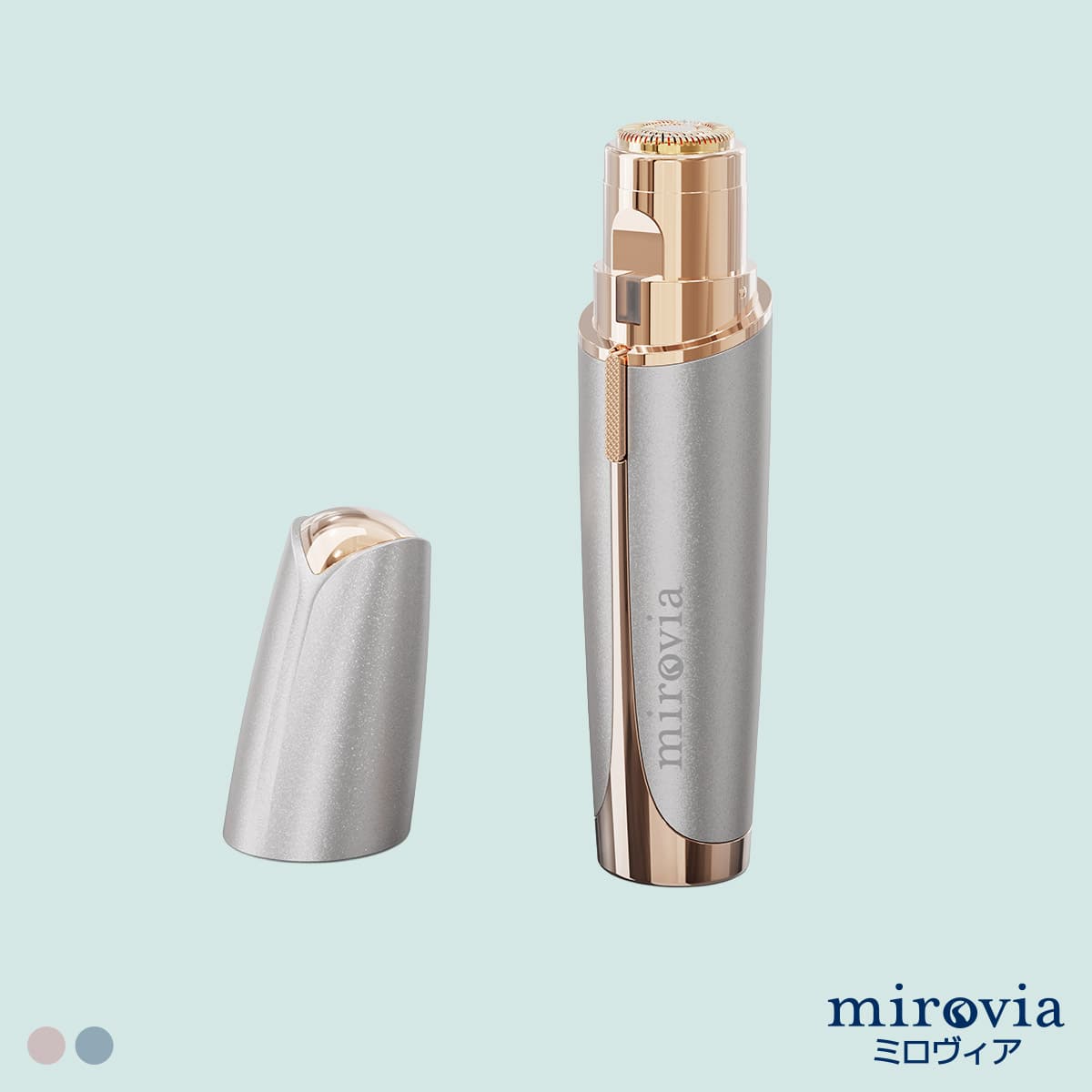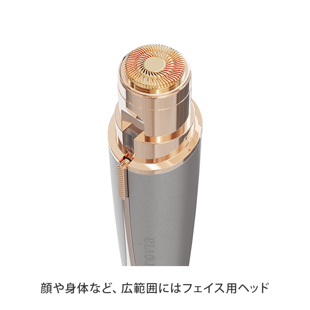 ミロヴィア トータルフェイスシェーバーは、水やシェービングクリームが不要な2WAY仕様の電動フェイスシェーバー。顔や身体などの比較的広範囲を剃る場合はフェイス用ヘッドを、眉まわり・こめかみ・眉間・目のきわなど細かい部位を剃る場合はブロウ用ヘッドに付け替えて使用できます。コンパクトサイズだから、持ち運びにも便利です。電池式なので気になったときにどこでも手軽にお手入れができます。コスメのようなおしゃれな見た目で気分もアップ!気になるムダ毛のお手入れがこれ一本で解決!