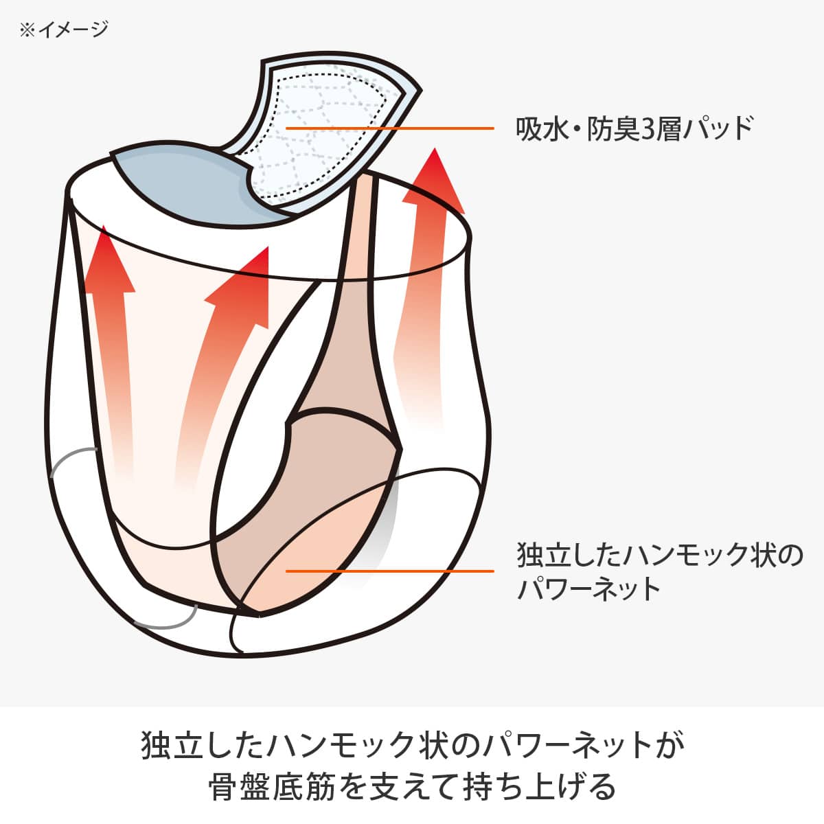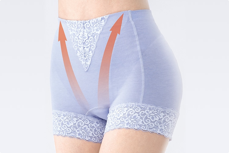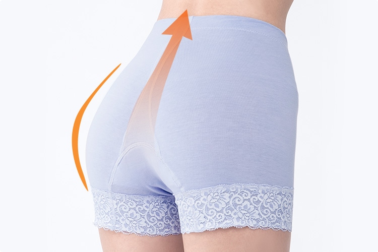 モレジェンヌは、ショーツクロッチ部分から浮くように設計されたハンモック状のパワーネットで前後から引き上げることで、ゆるみにくい体作りを着用中に意識づけします。