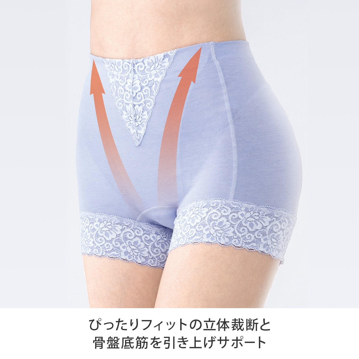 モレジェンヌは、立体裁断なので、身体にぴったりフィット。ハンモック状のパワーネットが骨盤底筋を引き上げてサポートします。お腹すっぽりタイプで、安心感のある1分丈。裾はオシャレな伸縮性のあるレースで、足回りを締め付けすぎません。