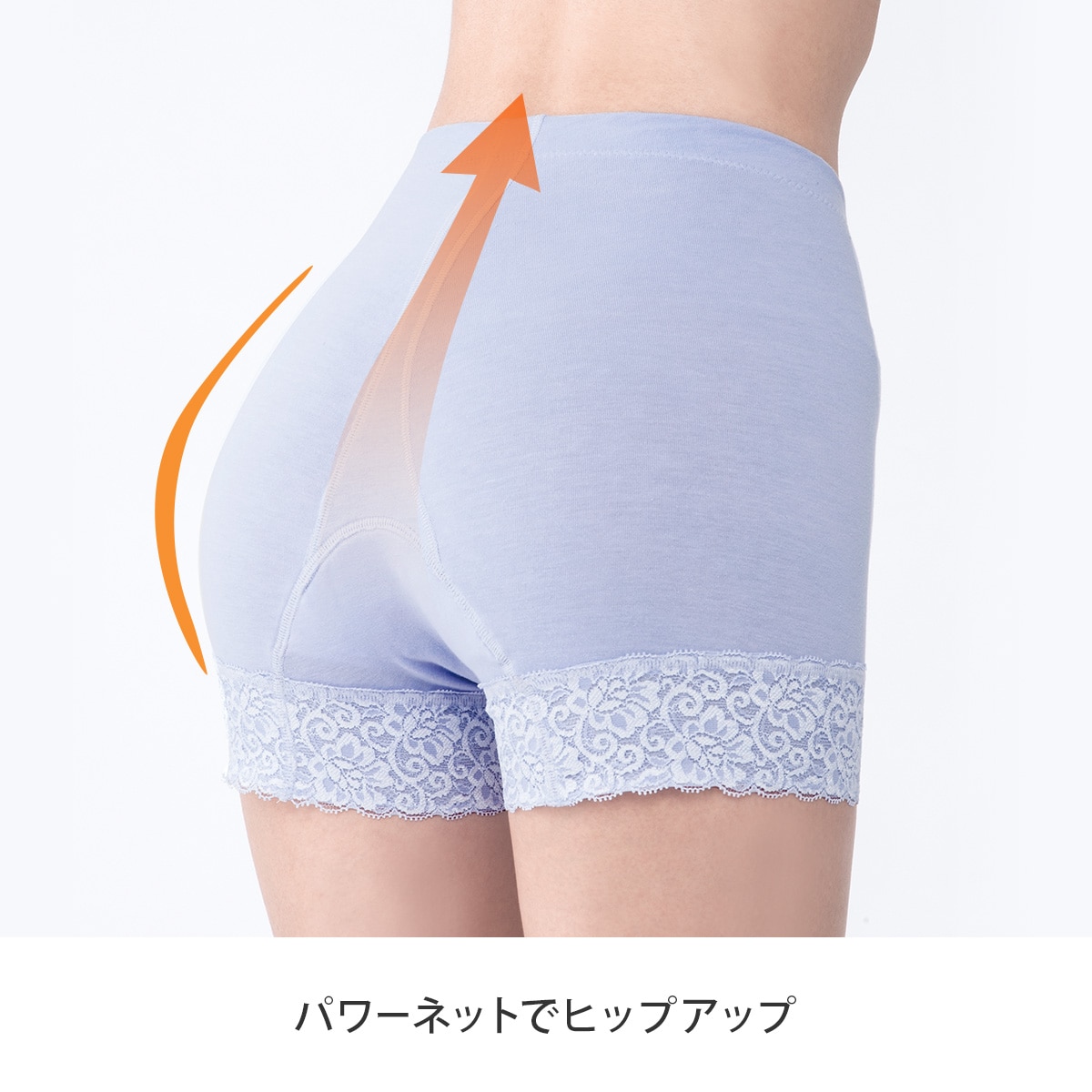 モレジェンヌは、ショーツクロッチ部分から浮くように設計されたハンモック状のパワーネットで前後から引き上げることで、ゆるみにくい体作りを着用中に意識づけします。