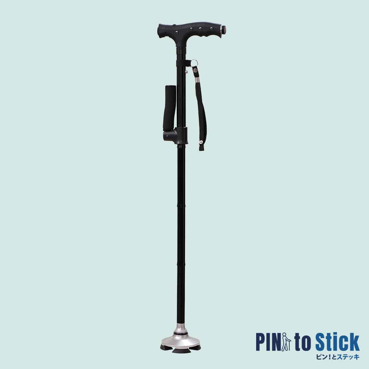 ピンとステッキは4点足で安心!多機能で様々な安全対策が取られたサポート杖です。高さ調節も5段階で可能。様々な体型にしっかりフィット。