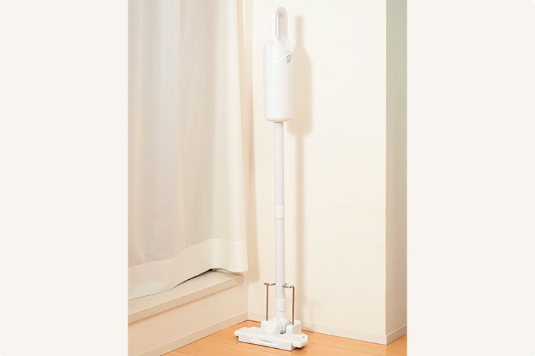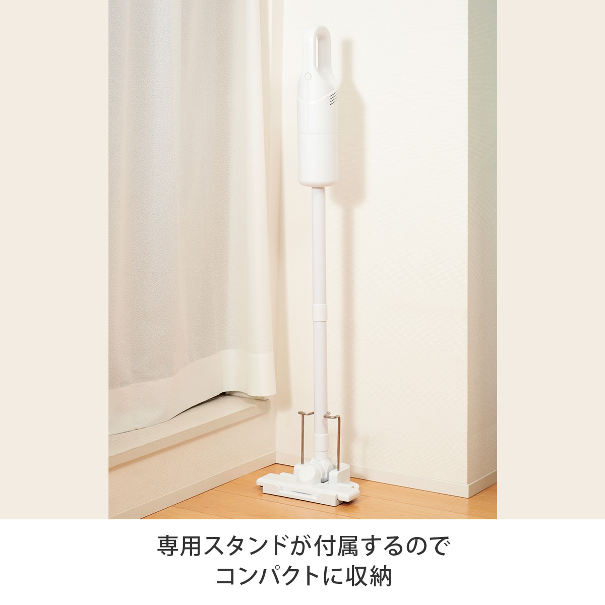 掃除機本体をスマートに収納できる専用スタンドが付属。幅約18cmのコンパクト設計で、玄関や部屋の隅にもすっきり収まります。使いたい時にすぐ取り出せるのも嬉しいポイント。
