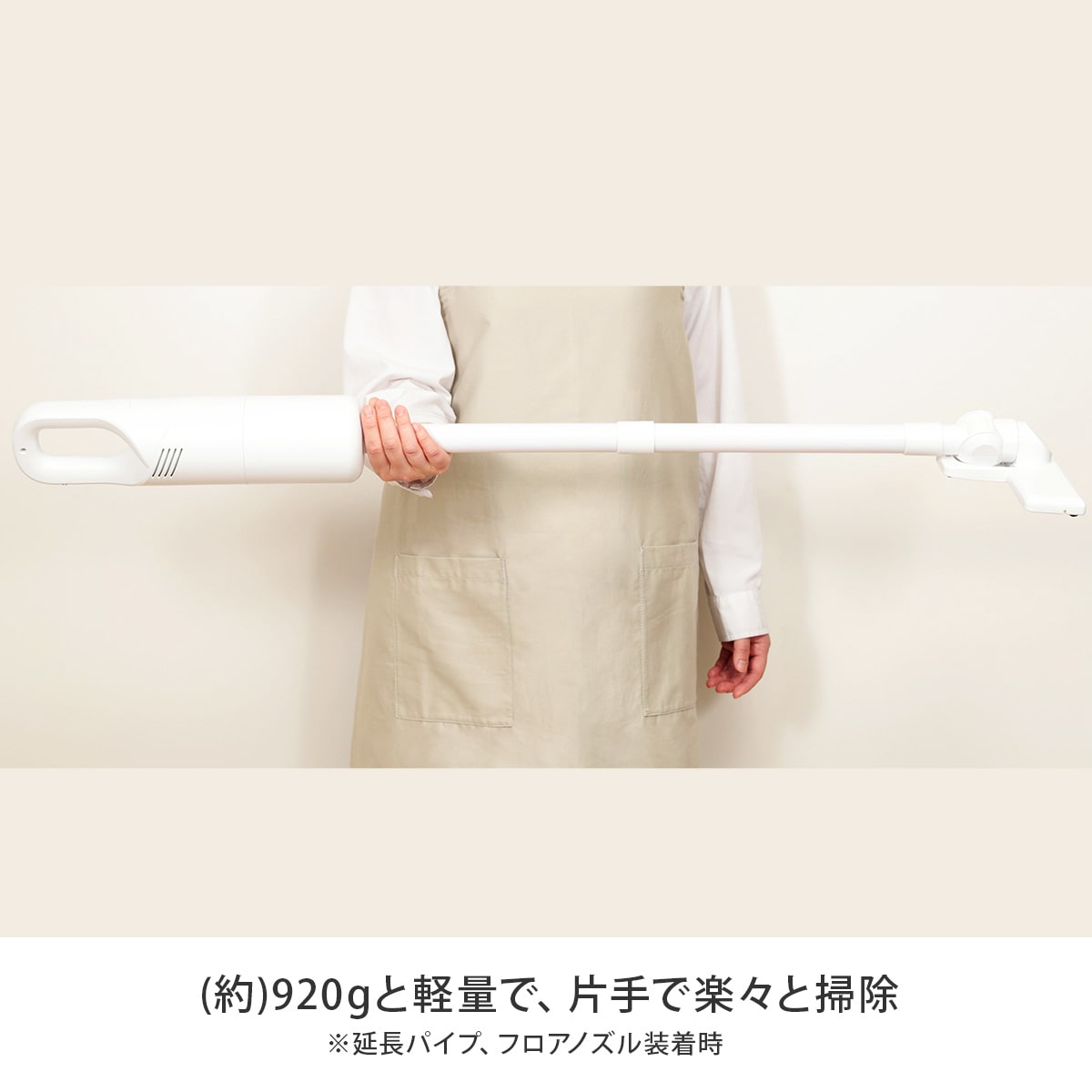 約920gの軽量設計で、片手でもラクラク操作可能。掃除機を持ち上げる動作も負担にならず、階段や棚の上などの掃除もスムーズ。力に自信がない方でも安心して使えます。
