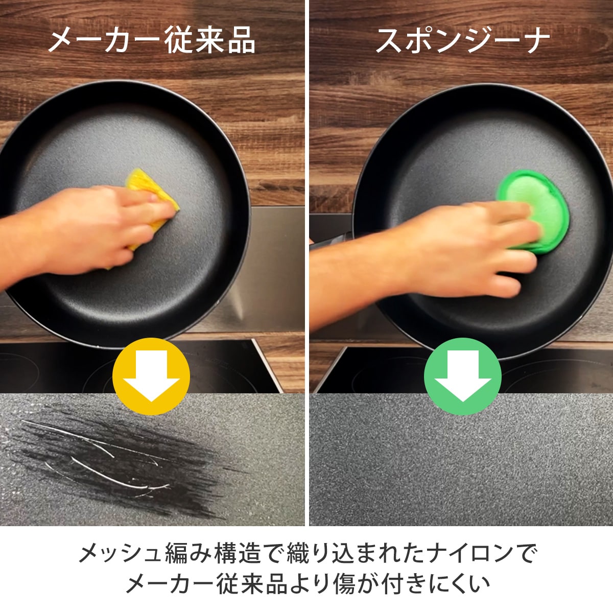 スポンジーナの最大の特徴は、なんといっても「メッシュ編みに織り込まれたナイロン」技術で、焦げたソースなどもスッキリ取り除けます。