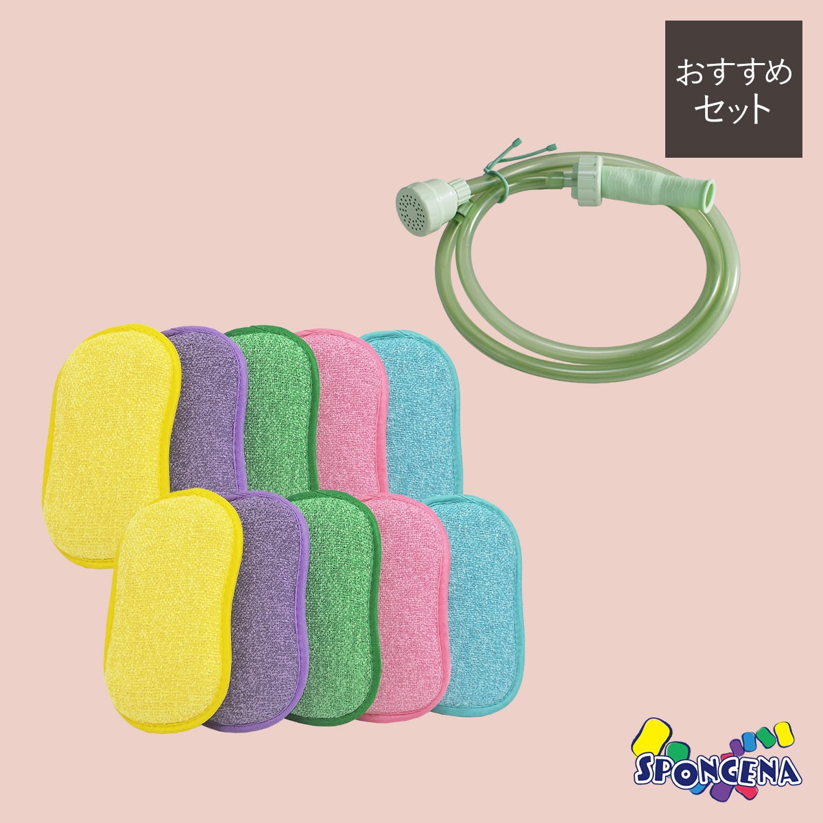 「スポンジーナ」は汚れをしっかり落とす万能スポンジ、「マジックホース」は差し込むだけで使える伸縮自在の簡易ホース。お掃除に活躍するセットです。