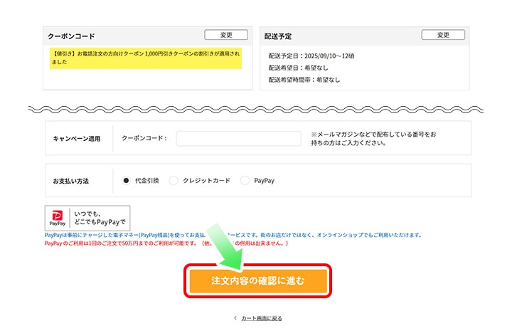 注文確認画面の「クーポンコード変更」を選択。クーポンコードを入力