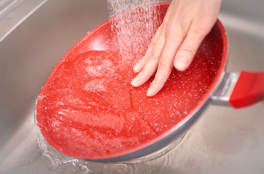 「フッ素(テフロン)加工やマーブルコート加工、ダイヤモンドコート加工のフライパンは、高温に加え、急激な温度差にも弱いです。そのため、使い終わった後すぐに水に浸けたり、洗ったりするのは避けてください。急激に冷えるとフライパンの金属が伸縮し、コーティングがはがれる原因になります。フライパンが完全に冷める、もしくは手でさわれるくらいにまで冷めてから洗うようにしましょう」