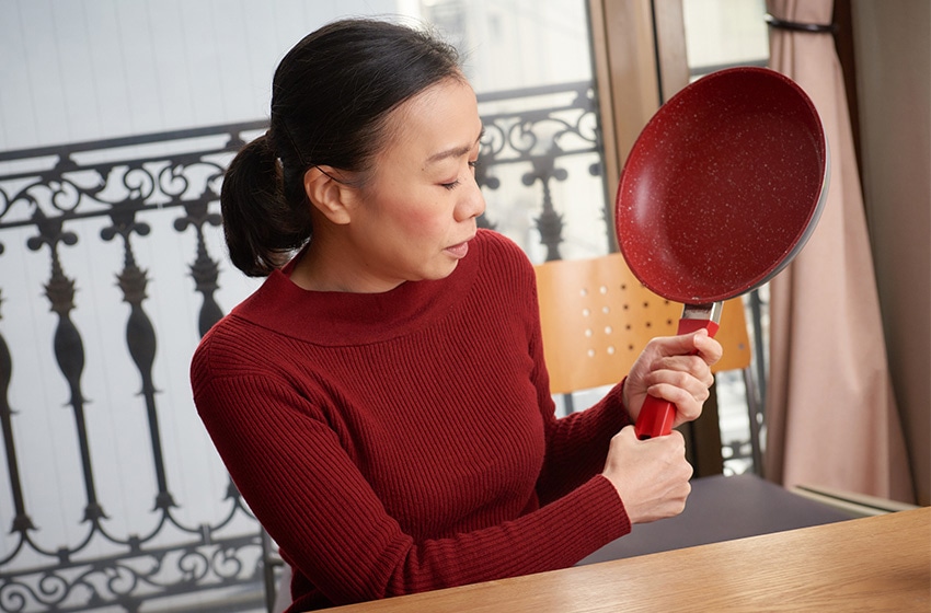 「料理のレシピでよく見かける、食材を入れる前にフライパンを熱するという工程。実はこれ、特にフッ素(テフロン)加工のフライパンでは絶対にやってはいけないことです。なぜなら、熱せられることによって素材にダメージが生じ、コーティングがはがれやすくなってしまうため。フッ素樹脂は、温度が高くなりすぎると有害物質が放出されるという報告もありますので、注意が必要です」