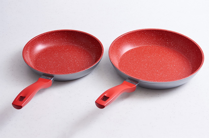フレーバーストーンは、アルミニウム、耐熱シリコン、ステンレスと3つの素材をベースに作られており、熱伝導性に優れているのが特徴。各素材の長所を兼ね備えているため、弱火から中火でもほぼ均等に熱が伝わり、食材がムラなくきれいに焼き上がります。中でも「ソテーパン」は、毎日の調理で活躍する定番のフライパンです。使い勝手の良い小型の20cm、万能サイズの24cm(写真左)、大家族にもおすすめの大型28cm(写真右)がそろっています。