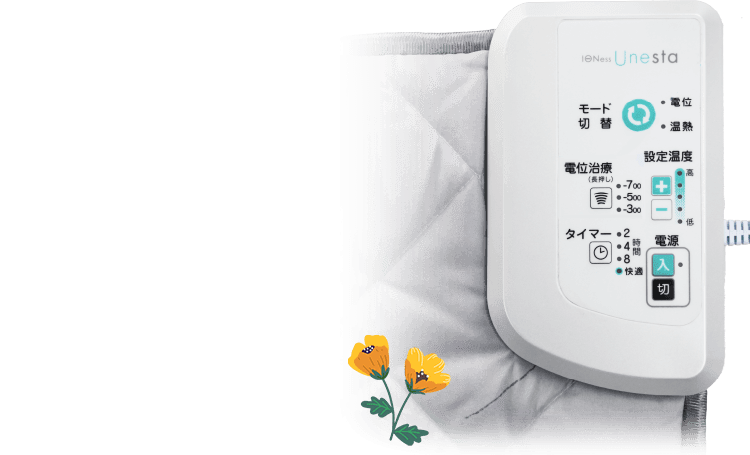 足元に内蔵した電位シートから全身にマイナス電位をかけることで、頭痛・肩こり・不眠症および慢性便秘の症状を緩和します。
