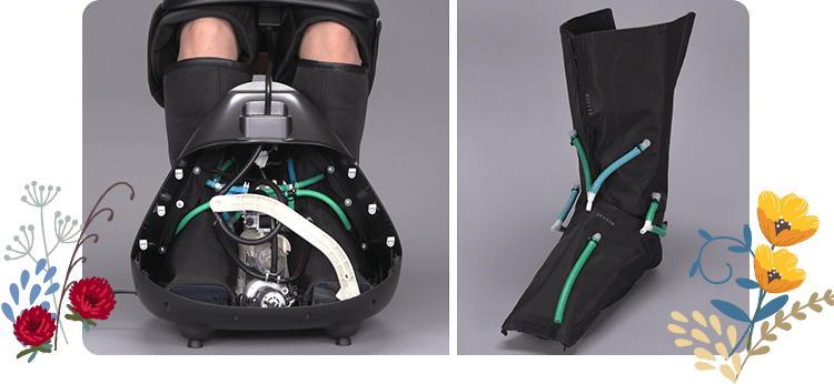 足裏部分に指圧式突起を配置。エアーの力で、指圧式突起に足裏を押し当て、刺激します。