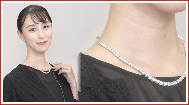 最大約0.8ctの大粒な石をセンターに置いた、ラウンドデザインの豪華なネックレスは、総石数はなんと106個で、合計約29ct!